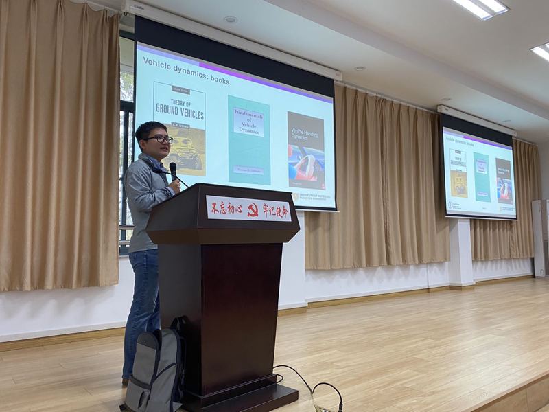 曹东璞从传统汽车学的发展开始讲解,循序渐进地引入到自动驾驶领域。报告前半段主要介绍经典的传统汽车学,曹东璞首先介绍了传统动力学目前发展的主要方向和关键问题,随后为同学们推荐了传统动力学的一些经典书籍,并对这些书籍一一进行了介绍,同时还向与会人员介绍了国际传统汽车动力学领域的专家及其学术著作和论文,引导与会人员更快更好地学习传统车辆动力学。