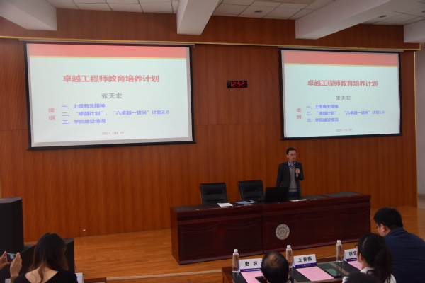 典礼伊始,张天宏对入选卓越工程师班的员工表示祝贺,并指出学院对于“卓越计划”培养工作的重视,展示近年来“卓越计划”培养所取得的成绩,希望通过“卓越计划”为国家输送更多优秀的人才,助力国家人才强国战略。他结合教育部“六卓越一拔尖”计划2.0指出,“卓越计划”就是要通过改革创新,培养具有创新意识、实践能力、进取精神、服务中华民族伟大复兴的社会主义建设者和接班人。最后,张天宏对所有在场的员工提出了殷切希望,希望同学们通过卓越班的学习和生活,能够提升自己高尚的道德情操、坚实的理论基础、创新的科学思维、踏实的实干精神,成为合格的卓越工程师!