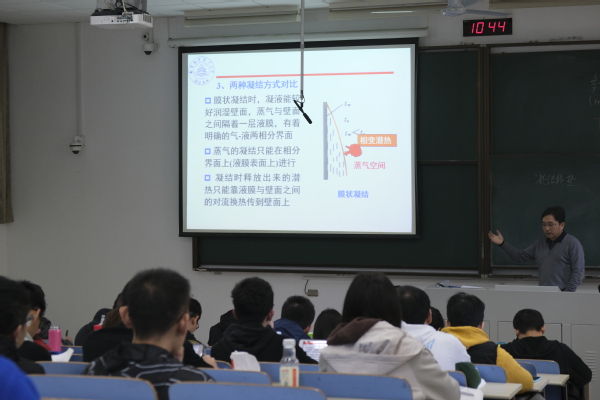 张靖周教授从物质的三态变化谈起,结合前续课程员工已有知识,联系日常生活中的冰箱、空调等,提出问题,引入到本章“有相变的对流换热”,提出凝结换热与沸腾换热都属于相变换热,然后引入本节课的主要内容“凝结换热”问题。