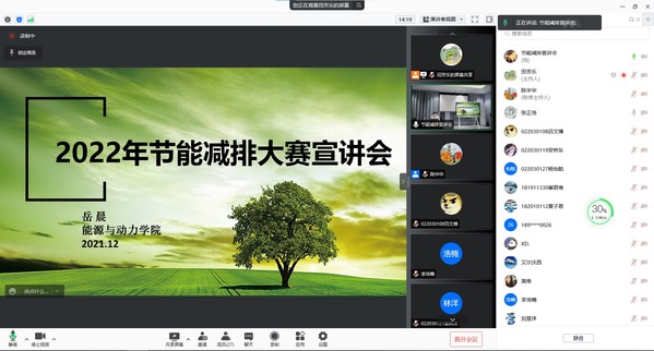 12月3日,威廉希尔williamhill官方网站第十五届节能减排竞赛宣讲会在明故宫校区A10-619报告厅举办,同时在腾讯会议进行直播。校节能减排大赛组委会主席、燃烧传热与热能系岳晨副教授、学院团委书记陈华华、全国节能减排大赛获奖员工代表王浩蕾、邓冲,以及线下线上来自全校各学院的同学参加了本次宣讲会。