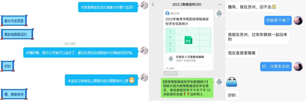 为了保证同学们能以最好的状态开启新学期“第一课”,学院领导、辅导员们也纷纷进入了线上课堂和员工宿舍,帮助同学们尽快调适最佳状态,督促同学们按时、按要求完成学习任务。同时,叮嘱大家提高疫情防控意识,注重劳逸结合,养成良好习惯。同学们纷纷表示,将热情饱满地投入新学期,争取新进步。