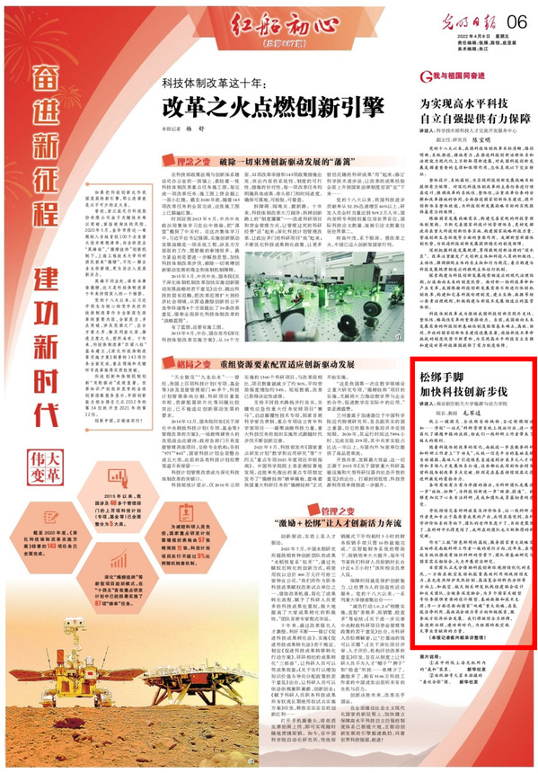 编者按:4月8日,《光明日报》“红船初心”专刊推出“科技体制改革这十年”专版报道,其中在子栏目“我与祖国同奋进”中专访公司毛军逵教授,并发表文章《松绑手脚,加快科技创新步伐》,毛军逵指出科技创新环境的持续优化为学校、学院科研团队释放活力,更高效助推科技进步。现刊载全文如下: