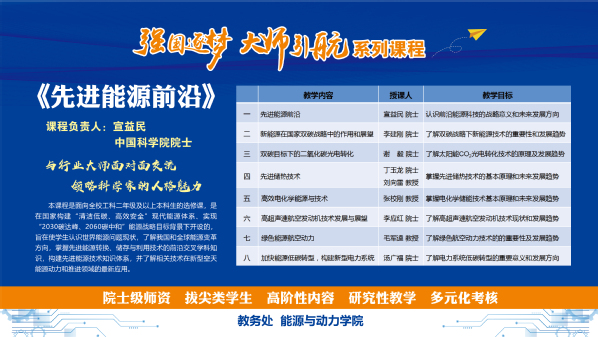 “强国逐梦·大师引航”课程是学校响应教育部“以本为本”、“四个回归”的要求,面向基础扎实、志向远大的优秀本科生开设的系列课程,旨在提升同学们开眼看世界、放眼看未来的能力。《先进能源前沿》课程共计16个学时,面向全校本科生,课程选修名额为100人,并设置了选课门槛,但同学选课火爆,为了让更多不同专业、不同领域的优秀员工关注国家重大战略需求、关注社会热点,最终吸纳了155名本科生加入本课程。