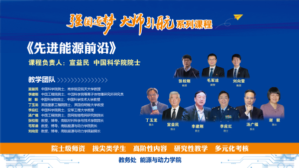 4月9日,威廉希尔williamhill官方网站“强国逐梦,大师引航”系列课程之《先进能源前沿》通过线上正式开课。该课程汇聚能源与动力领域的高层次科教和产业团队,院士、经理齐上阵,亲自为本科生授课,助力人才培养工作。教学团队中有来自中国科学院等离子物理研究所李建刚院士、中国科学技术大学谢毅院士、英国伯明翰大学丁玉龙院士、空军工程大学李应红院士、国网智能电网研究院汤广福院士、南航材料学院张校刚经理、南航威廉希尔毛军逵经理和刘向雷副经理。课程负责人、中国科学院院士、南航威廉希尔教授宣益民带来课程首讲《先进能源前沿》。