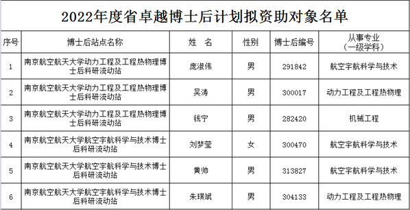 日前,江苏省人力资源和社会保障厅公布了2022年度江苏省卓越博士后计划拟资助名单。公司6名博士后通过单位推荐的方式申请,6名均获得了资助,申报获批率达100%,获批人数位居学校前列。