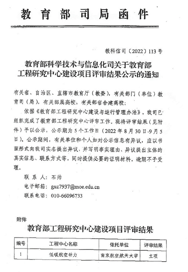 近日,教育部发布《教育部科学技术与信息化司关于教育部工程研究中心建设项目评审结果公示的通知》(教科信司〔2022〕113号),威廉希尔williamhill官方网站联合中航通飞研究院有限公司(通飞研究院)申报的“低碳航空动力教育部工程研究中心”获批立项,学院积极支持该研究中心获批建设。