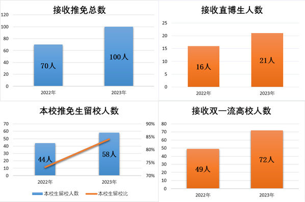 近日,学院2023年接收推荐免试研究生工作圆满结束,接收推免生数量和质量均创历史新高。截至目前,共接收推免生100人,较去年增加30人,增幅达43%。其中,接收直博生21人;本校推免生留校人数58人,留校比达84%;接收“双一流高校”生源72人,占比达72%,较去年增加23人,增幅达47%,实现了推免生数量与质量的“双提升”。