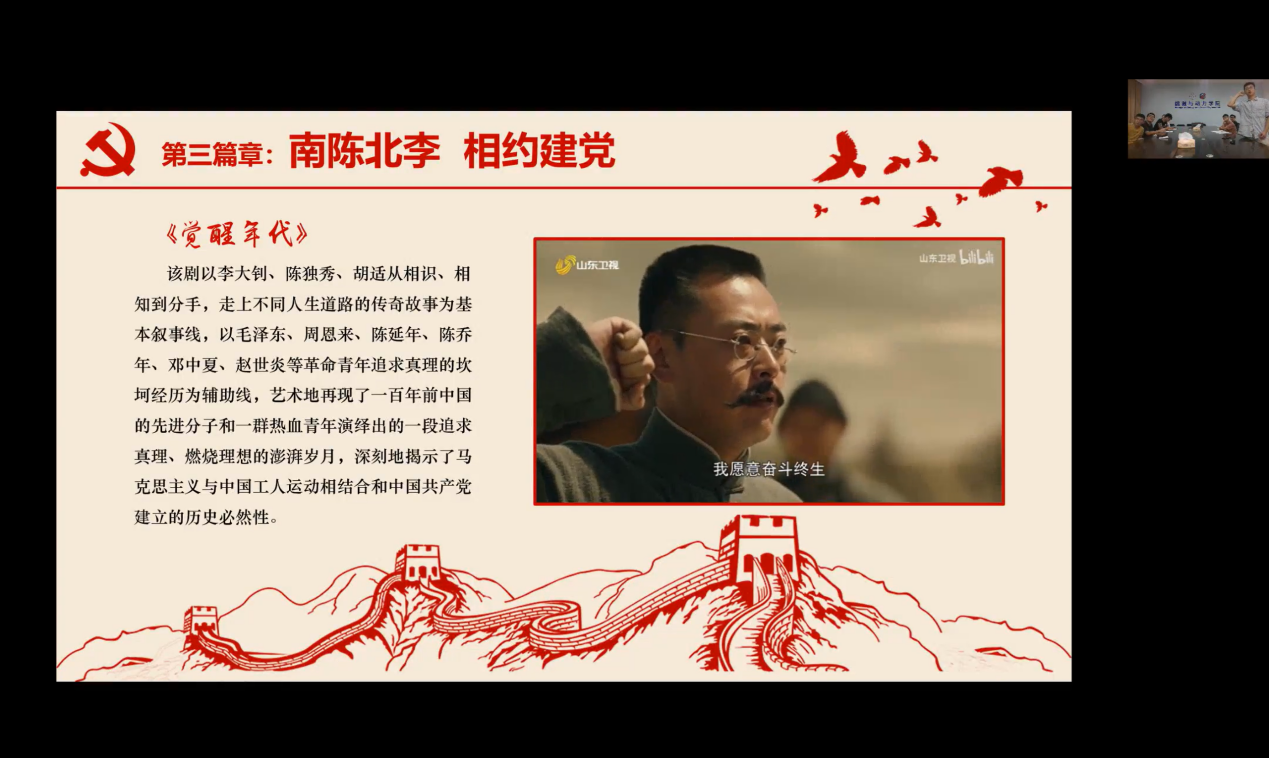 第三党支部魏云鹤同志从中国共产党全国代表大会的职权、代表产生、基本程序等方面介绍了党的二十大相关情况。控制党支部纪检委员杜佳彤同志和第三党支部的吕烨同志结合各自专业,围绕党的二十大,从科技和文化两个方面分别作了领学。随后,两个支部成员分饰不同角色依次为《我和我的父辈·诗》《我和我的祖国·回归》和《觉醒年代》三个影片的经典片段配音,抒发对党、对祖国、对老一辈航空人的敬仰,也将党日活动氛围推向高潮。