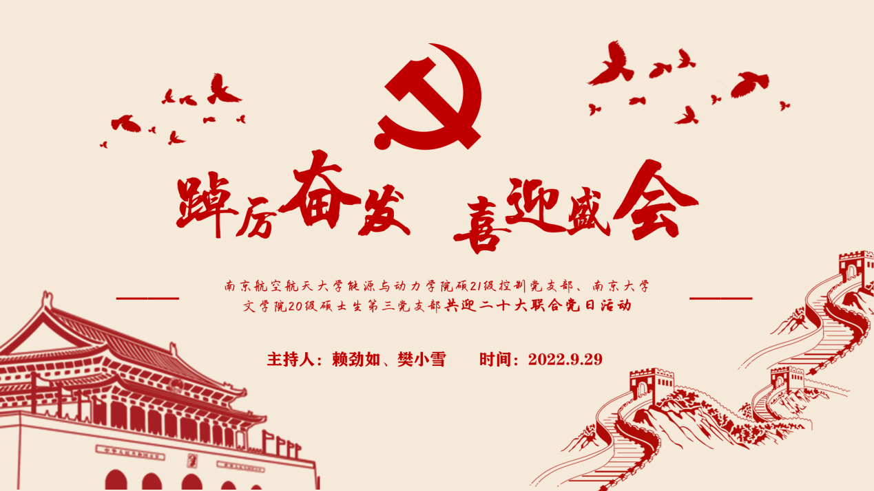 近日,为迎接党的二十大胜利召开,威廉希尔硕21级控制党支部(以下简称“控制党支部”)联合南京大学文学院20级硕士生第三党支部(以下简称“第三党支部”)开展“踔厉奋发,喜迎盛会”主题线上党日活动。活动由控制党支部书记赖劲如同志主持,两个支部党员和入党积极分子共计30余名同学共同参与。