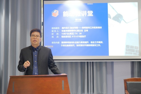 为喜迎党的二十大及七十周年校庆,学院精心组织,积极策划“能动微讲堂”系列培训活动,旨在进一步提升学院师生综合素质能力,提升学院治理能力,助力高质量发展。10月7日下午,学院在A10-619报告厅开展 “能动微讲堂”第五期活动,邀请公司党委宣传部新闻中心副主任王伟,作新闻宣传工作实务培训。学院教工党支部宣传委员、员工党支部书记及全体机关人员共同参加。活动由公司党委副书记樊小杰主持。