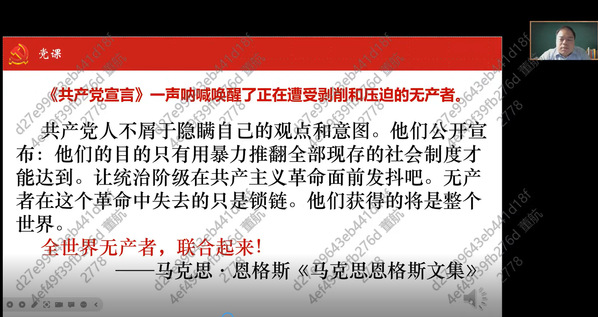 校员工资助管理中心主任唐志文从共产党的名称起源讲起,回顾了共产党的发展历程,讲述了《共产党宣言》的内容组成,从共产党人的观点、目的和意图等方面剖析了《共产党宣言》的历史意义与当代价值,号召学员们一同为共产主义事业奋斗。