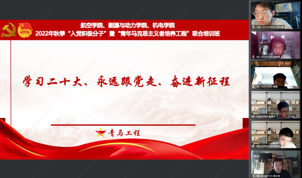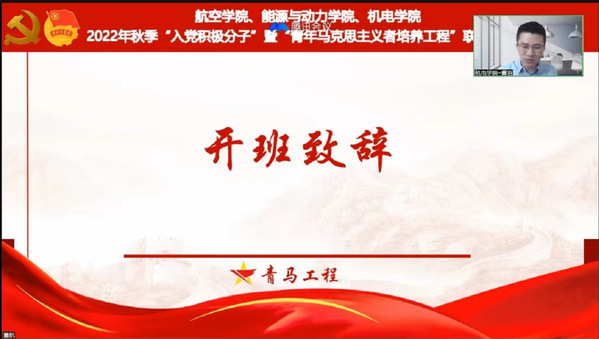 为认真学习贯彻党的二十大精神,深入开展党史学习教育,10月22日,公司与航空学院、机电学院联合举办2022年秋季入党积极分子培训班暨“青马工程”培训班。航空公司党委副书记杨杰,公司党委副书记樊小杰,机电公司党委副书记董羽,三个学院组织员、团委书记、全体辅导员共同出席了开班仪式。根据疫情防控相关要求,本次培训班采用视频会议的形式召开,600余名入党积极分子、青马工程学员同步参学。