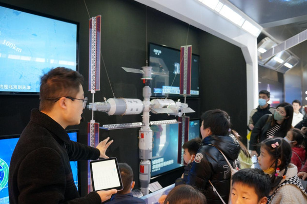 在航天学院博士生许传晓带领下,参观了航天公司产品基地,近距离了解火箭、卫星、空间站、火星探测,从认识航天器到学习航天史,“沉浸式”感受国家航天事业的发展,感悟航天精神。