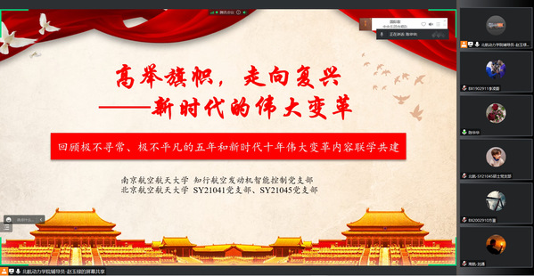3月10日,知行航空发动机智能控制团队与北京航空航天大学能动学院SY21041党支部、SY21045党支部联合开展“高举旗帜,走向复兴——新时代的伟大变革”联学共建。北航能源与动力工程学院辅导员赵玉禄主持活动,公司团委书记、研究生辅导员陈华华参加活动。