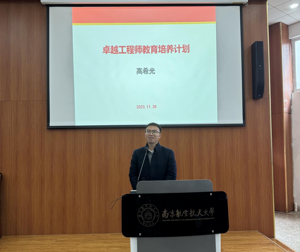 典礼伊始,高希光对入选2022级卓越工程师班的同学表示祝贺,并希望同学们通过卓越工程师班的学习和生活,能够树立高尚的道德情操、打好坚实的理论基础、培养创新的科学思维、保持踏实的实干精神,并祝愿大家可以在学习中将个人发展与南航发展和中国航空发动机事业相结合,努力成为合格的卓越工程师!