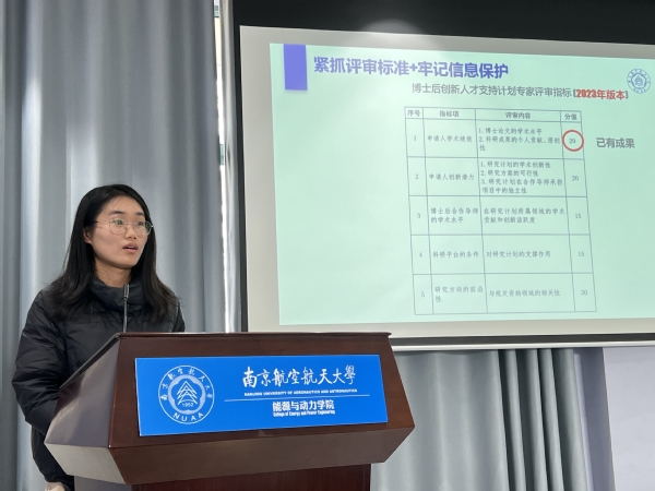 集团优秀长空博士后许宇航、吴闽强就博士后项目申报分别做了分享。许宇航从学术绩效、创新潜力、博士后合作导师的学术水平、科研平台的条件、研究方向的前沿性等方面详细介绍了申报书撰写中需要注意的细节,强调了紧抓评审标准、牢记信息保护的重要性。吴闽强从申报人的角度重点讲解了申报书撰写注意事项,结合其申报经验讲解了申报书评审可能的关注点,并就撰写高质量申报书进行了详实的解读。